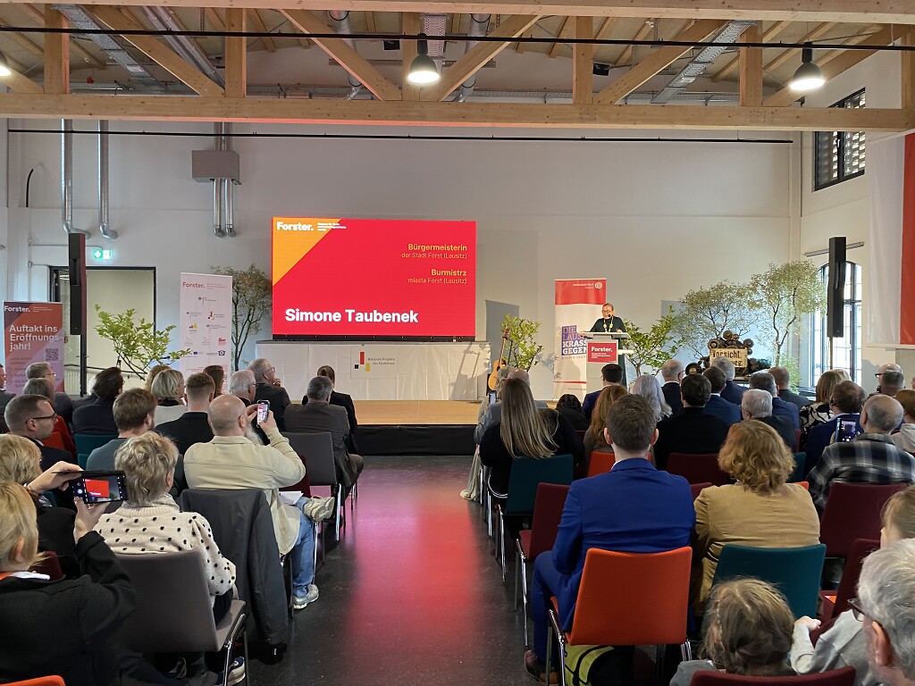 Nach der offiziellen Begrüßung durch die Forster Bürgermesieteriun Simone Taubenek und die Rosenkönigin Stefanie III. fand ein Banddurchschnitt statt, unter anderem mit Dr. Dietmar Woidke (Ministerpräsident des Landes Brandenburg und Dr. Klaus Freytag (Staatskanzlei, Lausitzbeauftragter). Im neuen Veranstaltungraum wurden die Grußreden anlässlich der baulichen Übergabe von Bürgermeisterin, Simone Taubenek, Ministerpräsident, Dr. Dietmar Woidke, Parlamentarischer Staatssekretärs Bundesministerium für Wohnen, Stadtentwicklung und Bauwesen, Sören Bartol, Direktor des Büros für internationale Zusammenarbeit und Europäische Territoriale Zusammenarbeit im Marschallamt Lubuskie, Radosław Brodzik gehalten.