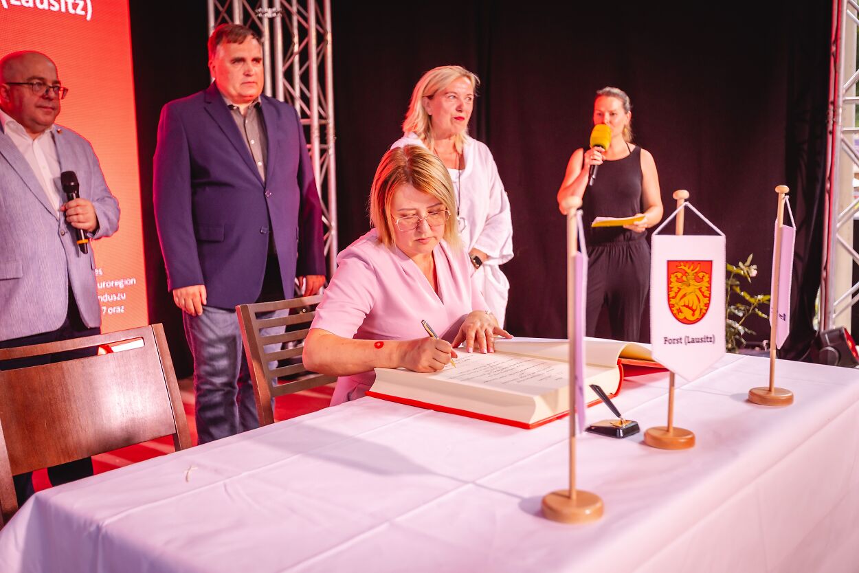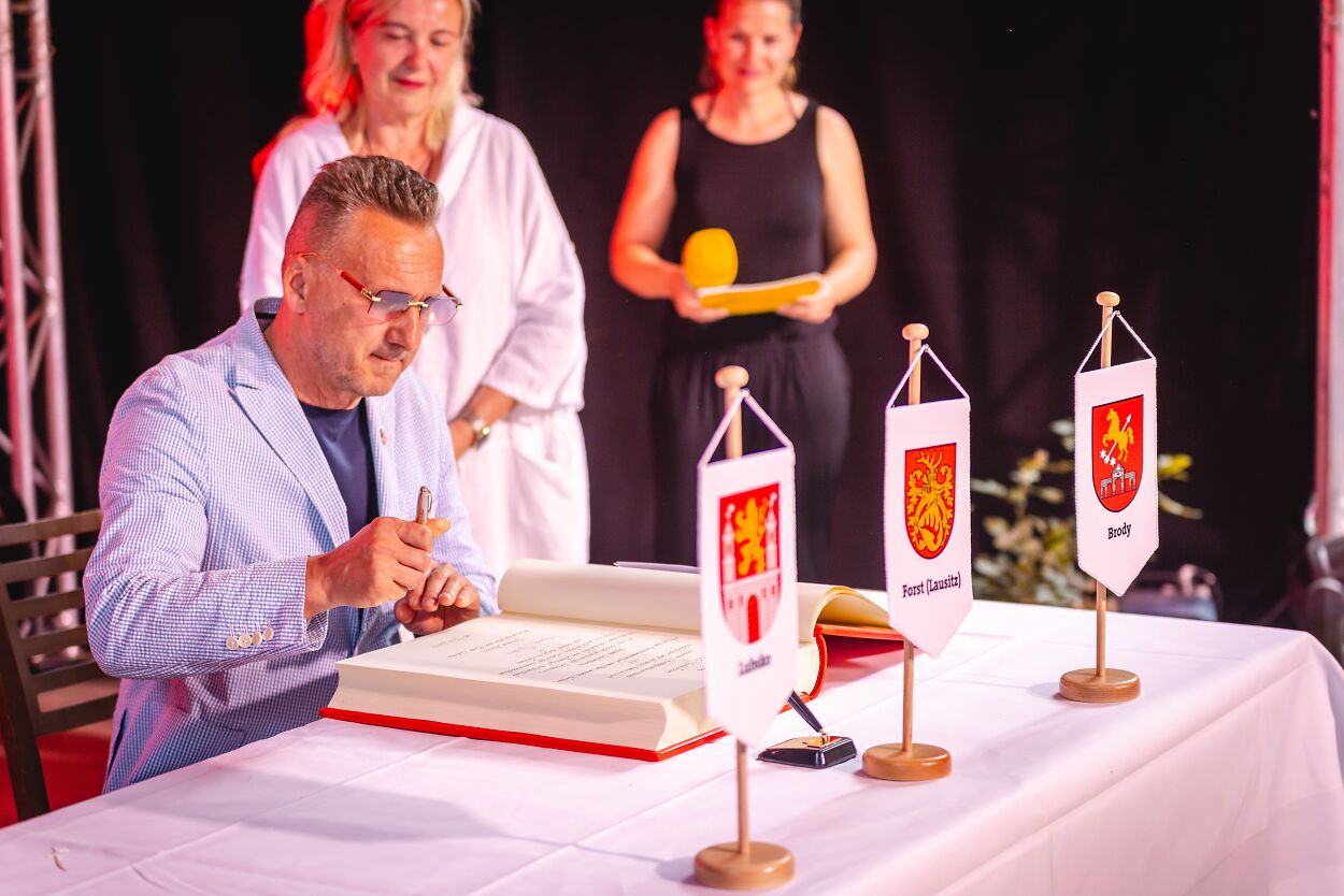 Ein bedeutender Moment während der Rosengartenfesttage war der festliche Eintrag in das Goldene Buch der Stadt Forst (Lausitz). Frau Beata Kowalczuk, Bürgermeisterin von Brody und Herr Janusz Dudojć, Bürgermeister von Lubsko verewigten sich am Samstag auf der Bühne des Musikpavillons als Zeichen der Verbundenheit und des gegenseitigen Respekts.