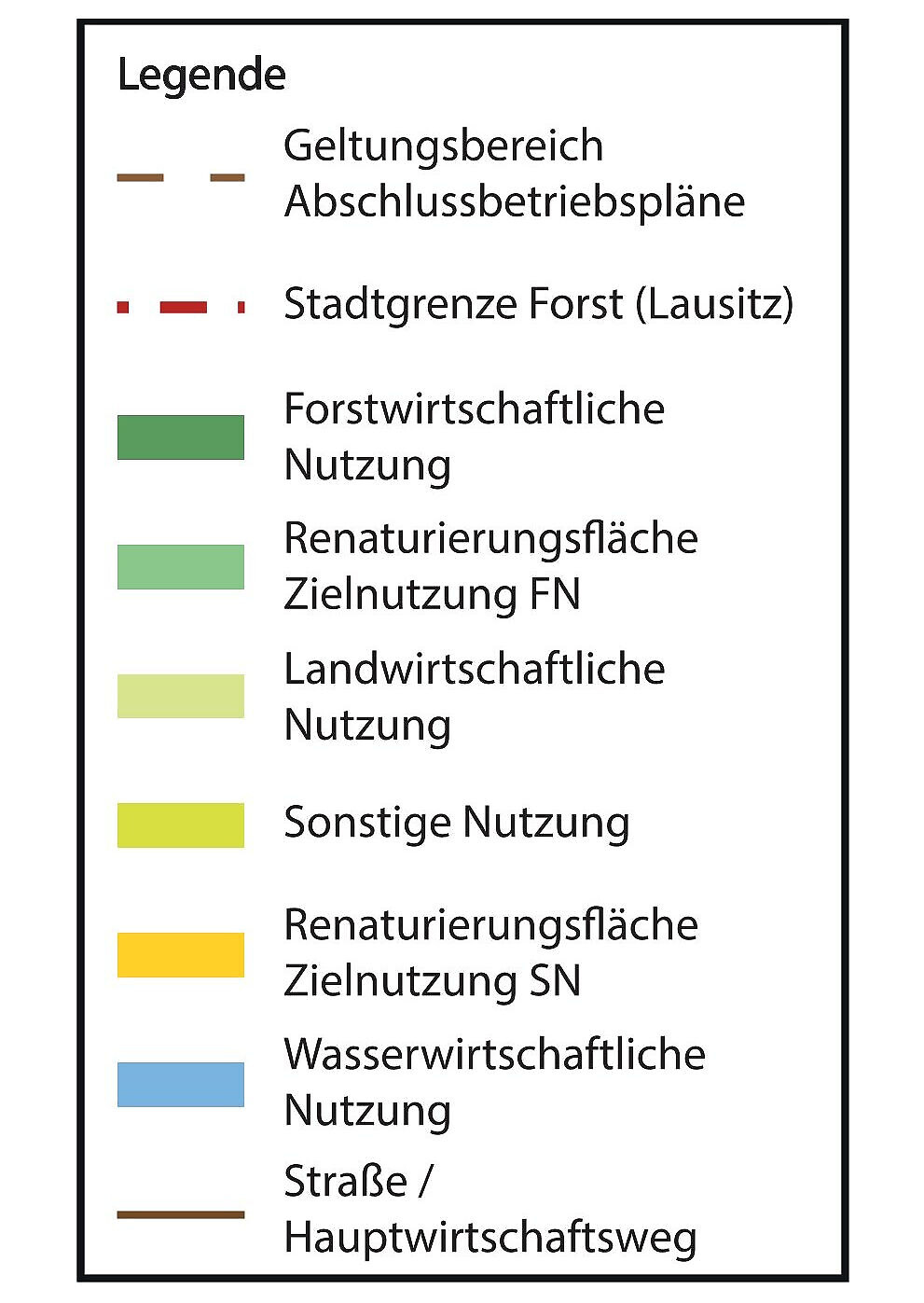 Die Nachnutzung der Bergbaufolgeflächen hinsichtlich Freizeit/ Erholung/ Tourismus stellt gemäß Braunkohlenplan keine separate Nutzungsart dar und ist der der Forstwirtschaft, Renaturierungsflächen und sonstigen Flächen (Straßen, Wege) zu integrieren.