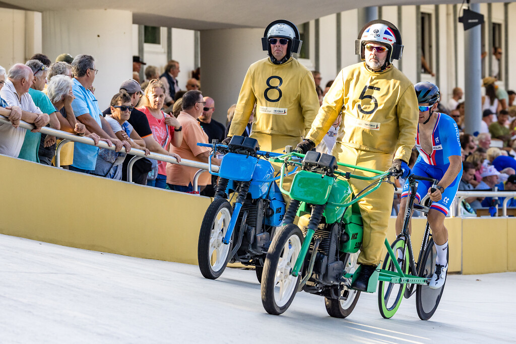 Auf der Radrennbahn: Zwei Männer stehen auf Mottorrädern, dahinter fährt ein Fahrradfahrer. Im Hintergrund ist das Publikum zu sehen.