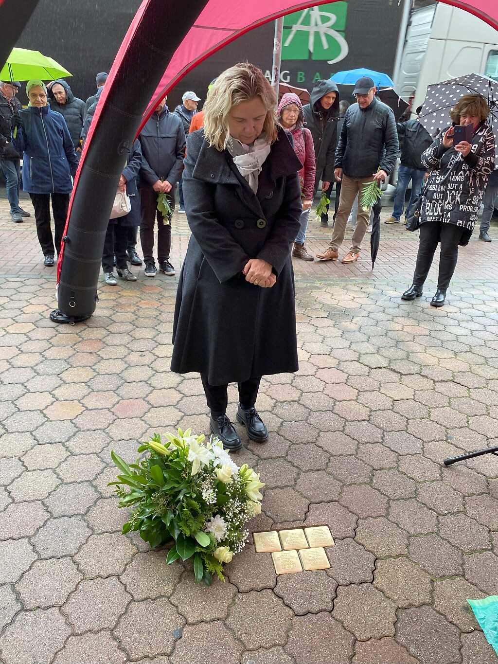 Im Beisein zahlreicher Vertreter aus Politik, Verwaltung sowie Bürgerinnen und Bürger wurden als Zeichen gegen das Vergessen die Stolpersteine für dem ehemaligen Wohnhaus der Familie eingebracht und Blumengebinde vor dem ehemaligen Wohnhaus der Familie niedergelegt.