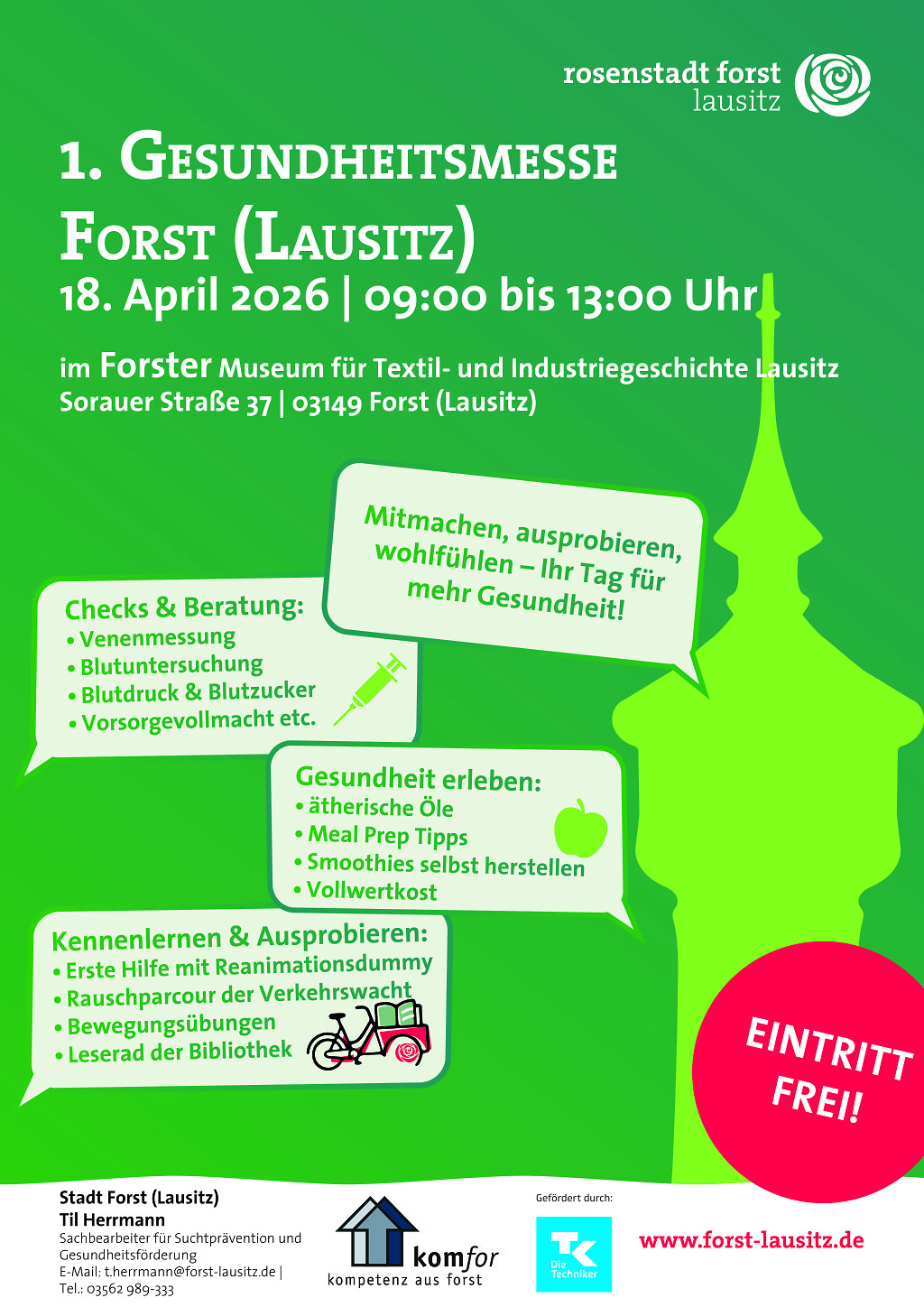 Unter dem Motto „Mitmachen, Ausprobieren, Wohlfühlen“ lädt die Stadt Forst (Lausitz) am Samstag, den 18. April 2026, von 9:00 bis 13:00 Uhr zu einer öffentlichen Gesundheitsmesse im Forster Museum für Textil- und Industriegeschichte Lausitz ein. Die Veranstaltung ist offen für alle Einwohnerinnen und Einwohner der Stadt Forst (Lausitz); eine Anmeldung ist nicht erforderlich.