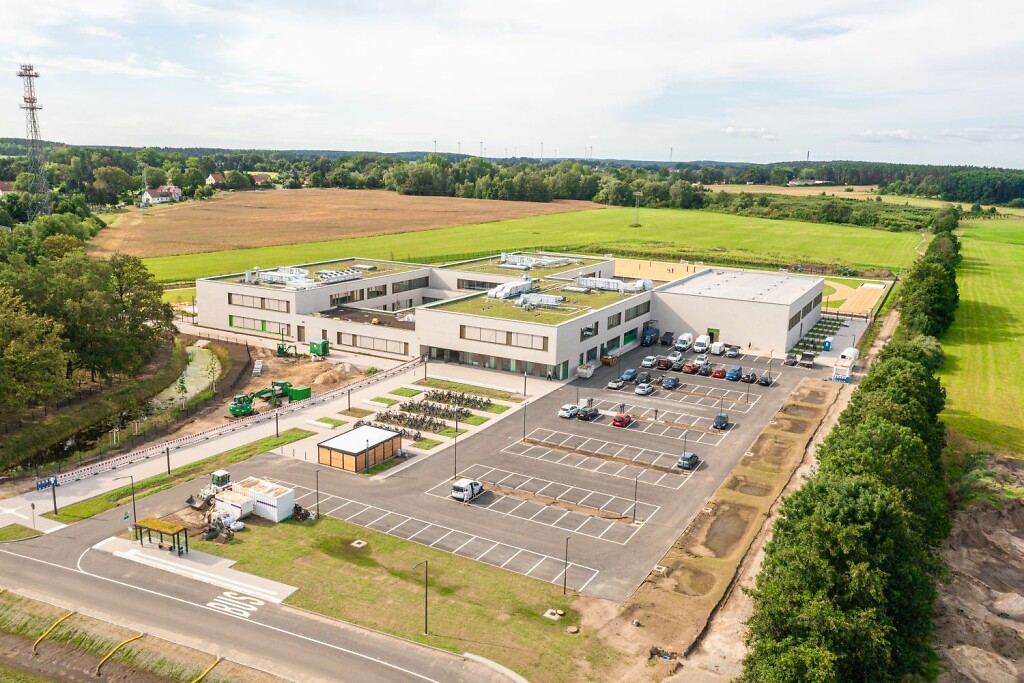 Luftaufnahme eines modernen Schulgebäudekomplex mit großem Parkplatz und umgeben von Feldern und Bäumen.