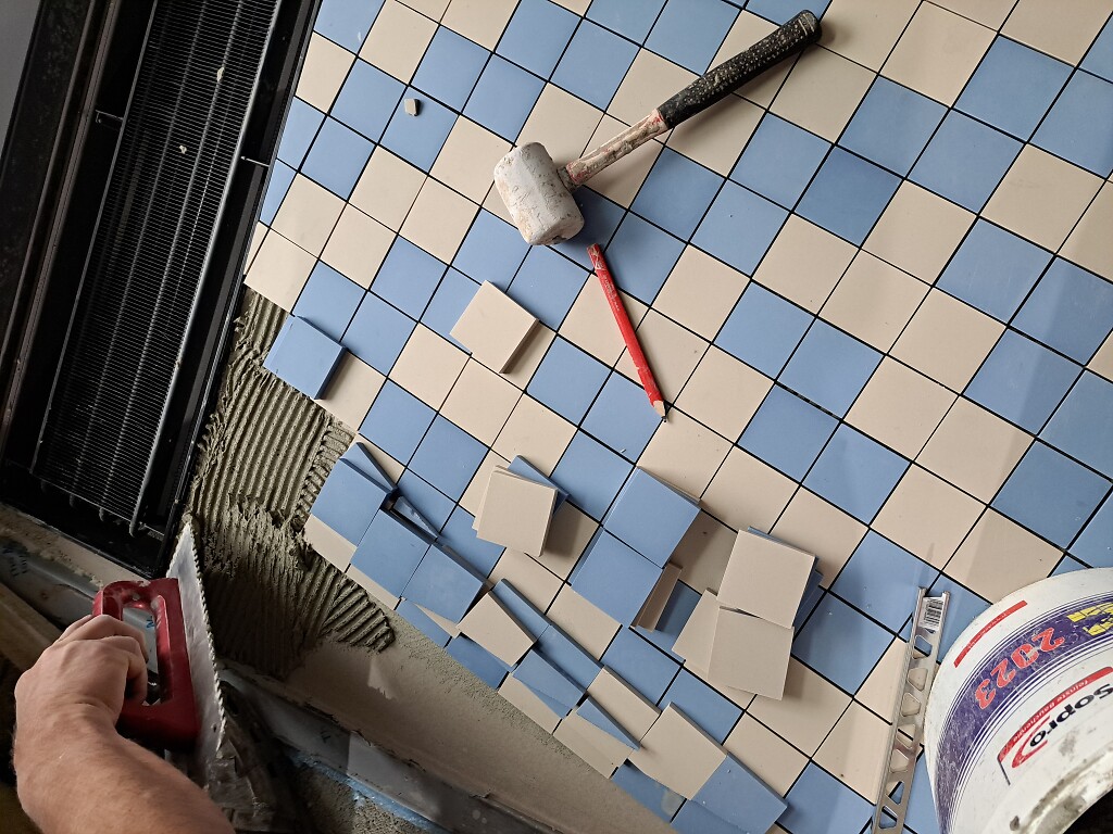 Nahaufnahme eines blau-beigen Bodenmosaiks aus quadratischen Fliesen. Mehrere Fliesen werden gerade verlegt; Kleber, lose Fliesen, ein Gummihammer und ein Bleistift liegen auf dem Boden. Eine Hand trägt mit einer Kelle Fliesenkleber auf.