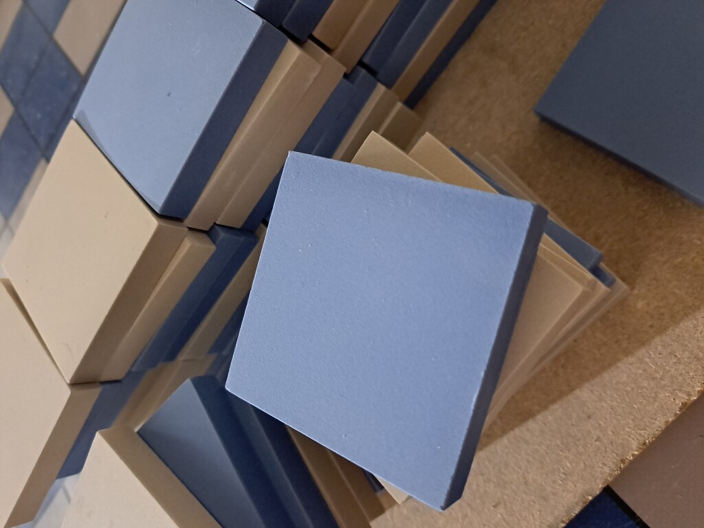Nahaufnahme von gestapelten blau-beigen quadratischen Fliesen