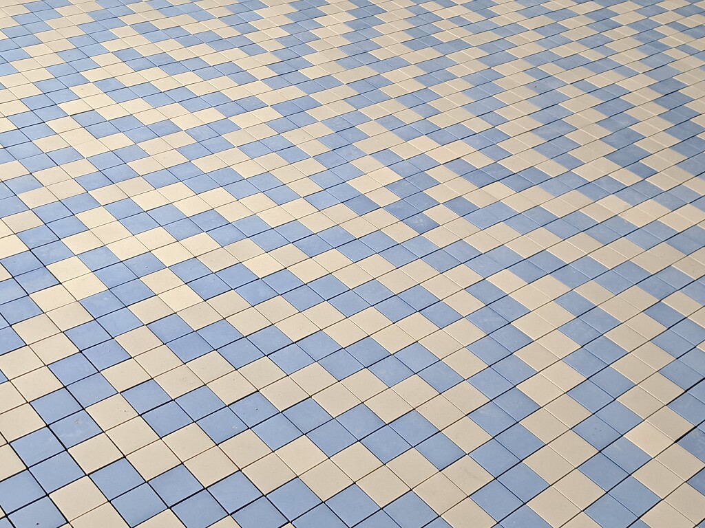 Blau-weiße Feinsteinzeug-Bodenfliesen , Fotograf: Diana Priel, Bildrechte: Stadt Forst (Lausitz)/ EBKTM