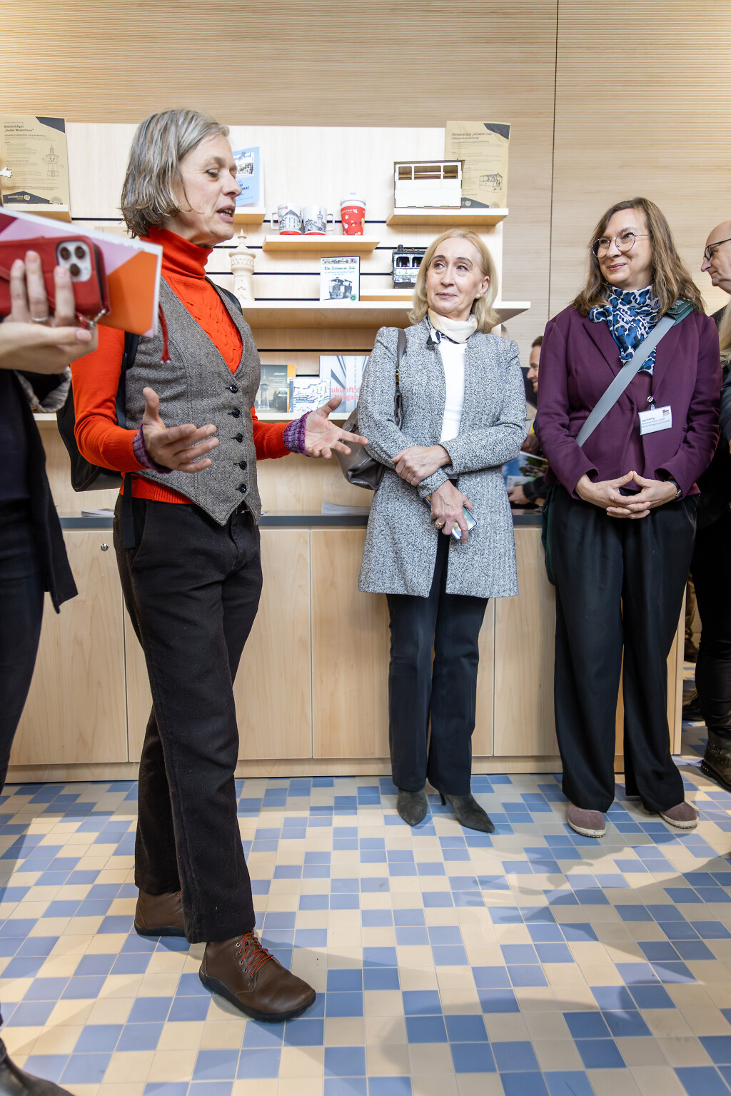 Mehrere Personen stehen in einem hellen Innenraum auf einem blau-beigen Fliesenmosaik. Eine Frau spricht mit geöffneten Armen, drei weitere Frauen hören aufmerksam zu. Im Hintergrund sind Regale mit Büchern und Ausstellungsobjekten zu sehen.