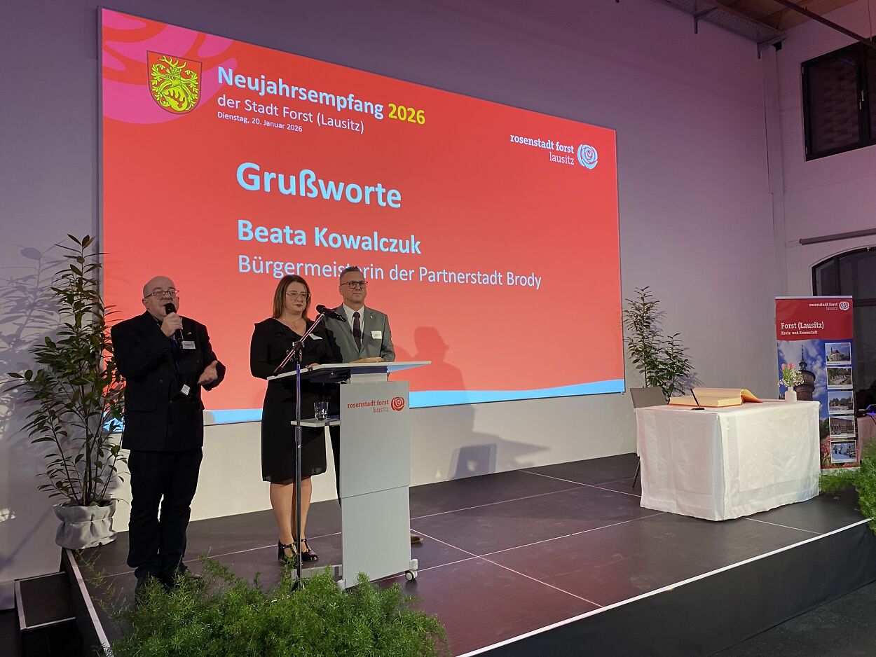 Nach der musikalischen Eröffnung begrüßte Bürgermeisterin Simone Taubenek die Gäste und hielt die Neujahrsrede. Darin blickte sie auf das Jahr 2025 zurück und gab einen optimistischen Ausblick auf die Herausforderungen und Vorhaben des Jahres 2026. Grußworte überbrachten der Lausitz-Beauftragte Dr. Freytag, die Bürgermeisterin der Stadt Brody, Beata Kowalcuk, sowie der Bürgermeister der Stadt Lubsko, Janusz Dudojc. Sie unterstrichen den Wunsch nach einer weiterhin vertrauensvollen und intensiven Zusammenarbeit über die Grenzen hinweg.
